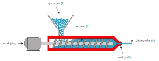 Bij het extruderen van rubberen profielen perst een draaiende schroef (1) onder hoge druk en warmte granulaat of strippen (2) door een spuitplaat (matrijs, 3). Door verwarming en samendrukking van het materiaal smelt het granulaat of worden de strips zacht. Als het zachte materiaal de matrijs verlaat, heeft het de vorm van de doorsnede van de matrijs aangenomen. Het profiel (4) wordt vervolgens door een trekinrichting verder vervoerd en gekoeld met lucht of water of verder verhit naar gelang het uitgangsmateriaal (compound).