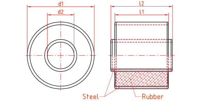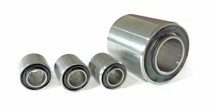 Silentblocks, metalen binnen- en buitenbus met rubber ertussen.